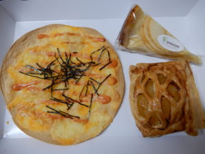 今日(2月26日)は、アップルパイ(100円)、明太子味のトルティーヤのようなパン(100円)、アップルタルト(198円)を買いました。