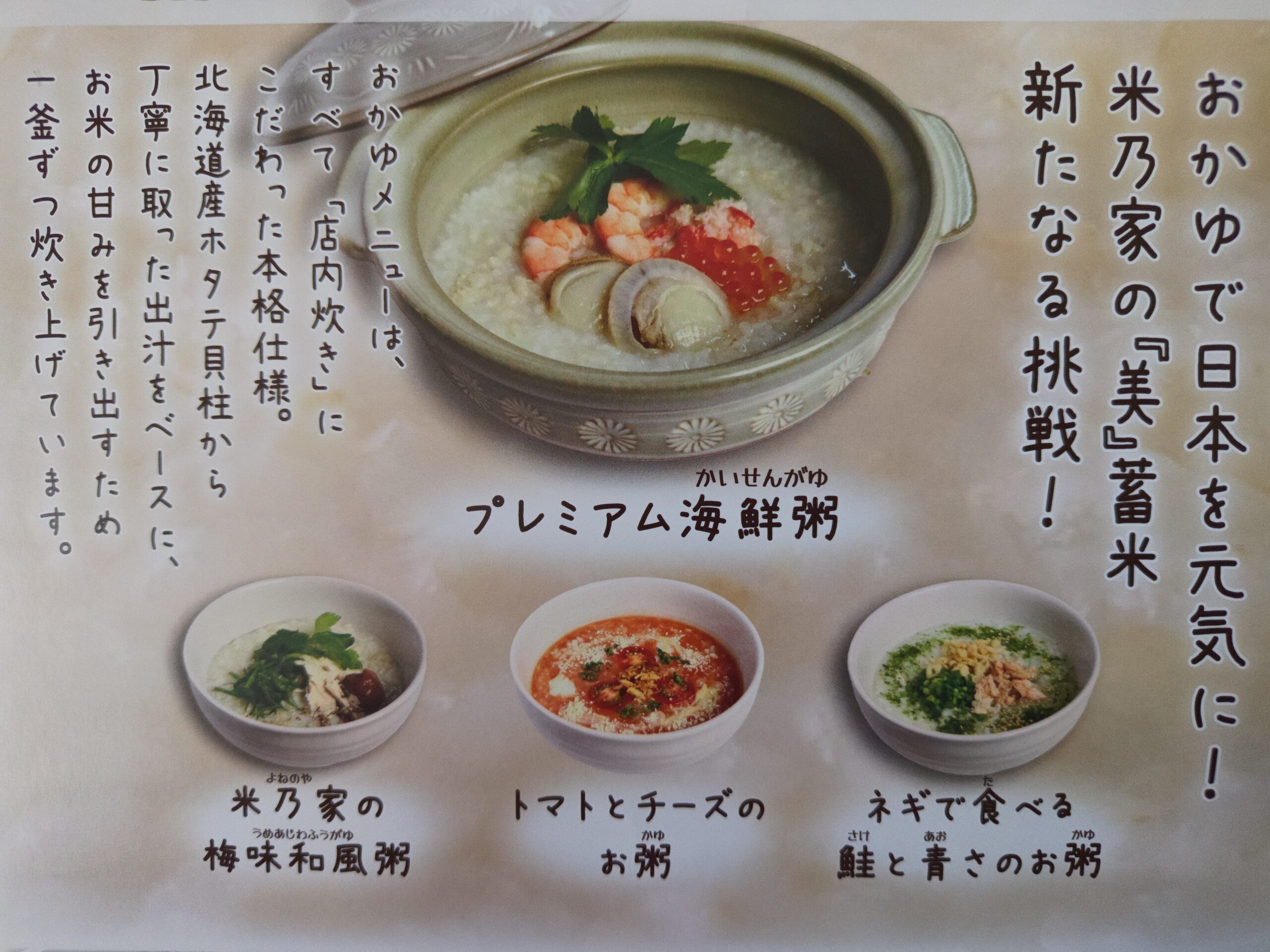 リニューアルした江別店でも、その想いがぎっしり詰まったお粥が提供されます。