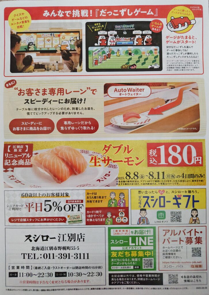北海道江別市にある「スシロー江別店」が、店舗リニューアルのため7月29日(火)〜8月7日(木)まで休業し、8月8日(金)より営業再開します。今回のリニューアルでは、話題の大型タッチディスプレイ「デジロー」を新たに導入。これまでの回転寿司の常識をくつがえす、まったく新しいデジタル体験が楽しめます!