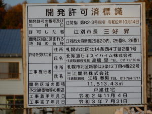 江別市大麻新町にかつてあった日本甜菜製糖株式会社の跡地が、宅地造成されることが分かりました。開発許可済標識には用途に戸建住宅と書かれています。
